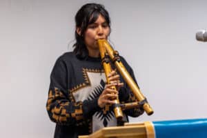 Student Kelly Yessilth plays traditional Navajo music on the flute during the Page campus end-of-year student award ceremony. (Courtesy of Coconino Community College)